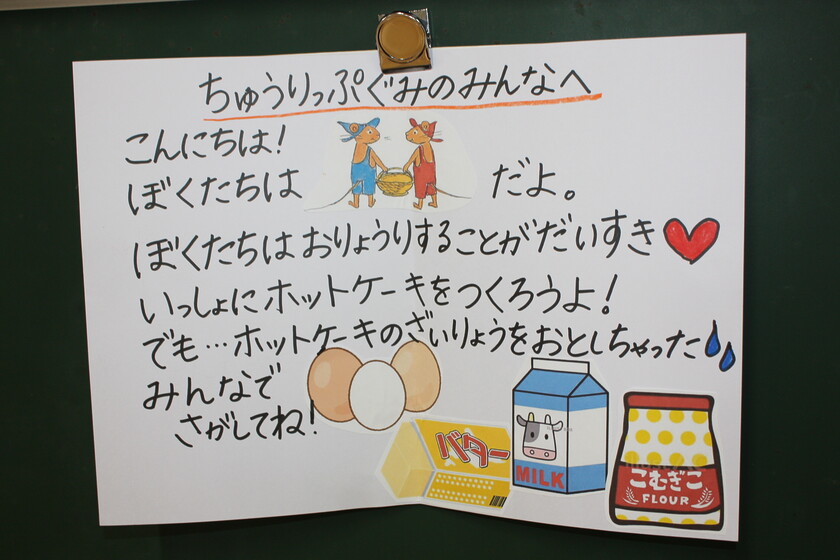 子どもたちは「大変なんだよ💦ホットケーキ作りたいのに材料落としちゃったんだって💦」と困った様子で教えてくれ「でもきっとどこかにあるはず!」と幼稚園の探検に出かけました!