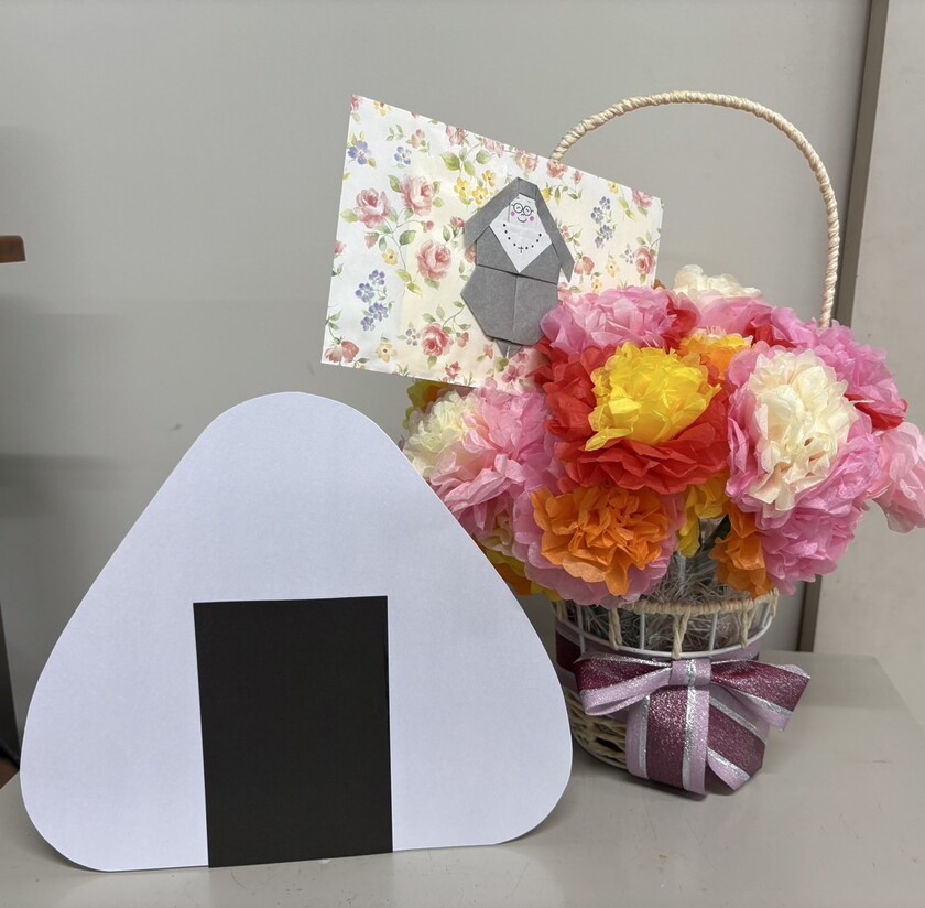 年長組の代表から毎月実施しているおにぎり献金と年長組が丁寧に作った花かごをプレゼント🎁