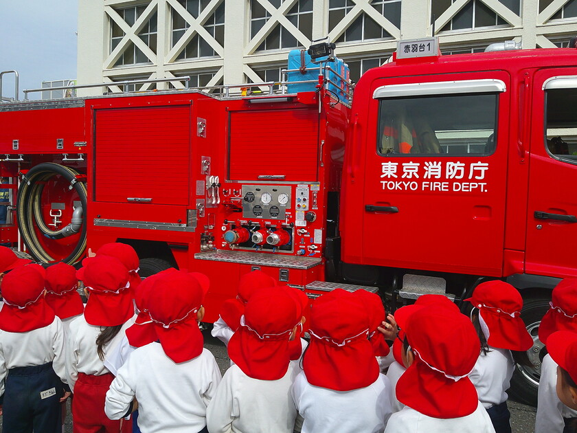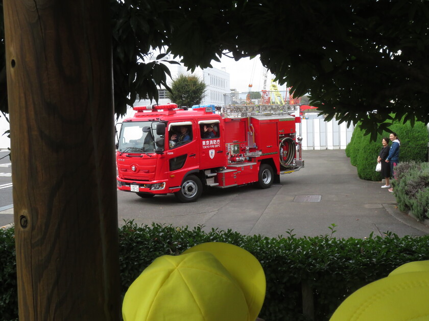 赤羽消防署赤羽台出張所から、ポンプ車と消防署の方々にもお越しいただき、火災を想定した避難訓練を行いました。