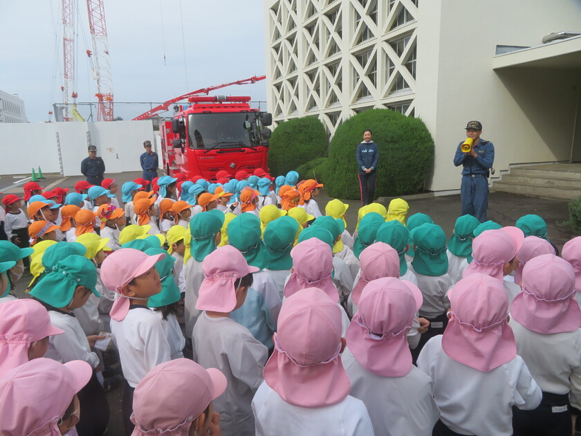 ベルを聞き、避難する子どもたちの様子を見て「煙が入らないように口と鼻をおさえておしゃべりをせず静かに避難できました。100点満点です!」