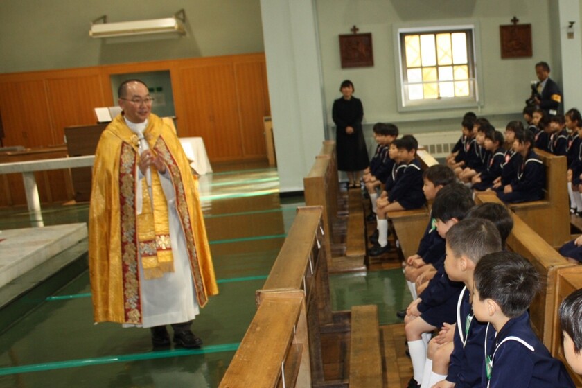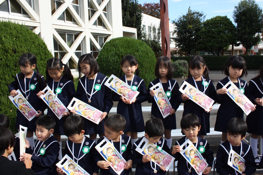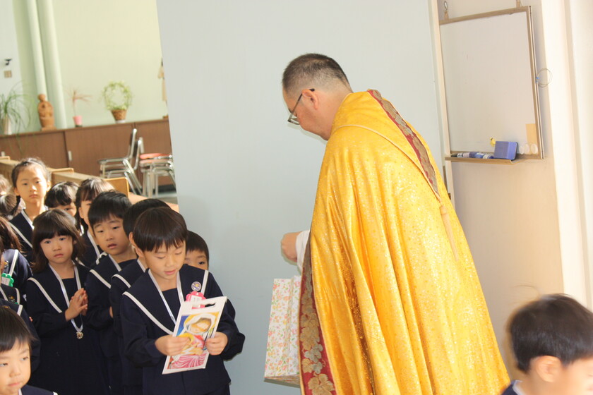 2025.11.12 Diary 七五三お祝い会 聖堂にてサレジオ会三島心神父様司式のもと、七五三のお祝い会を行いました。 全学年参加し、年長組が代表でおメダイをいただきました。 ここまで大きく成長できたことに感謝を込めて、またこれからも心身ともに健やかに過ごせますように・・・!
