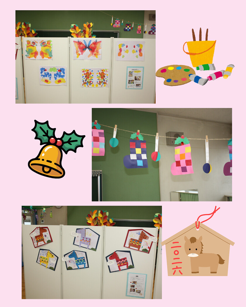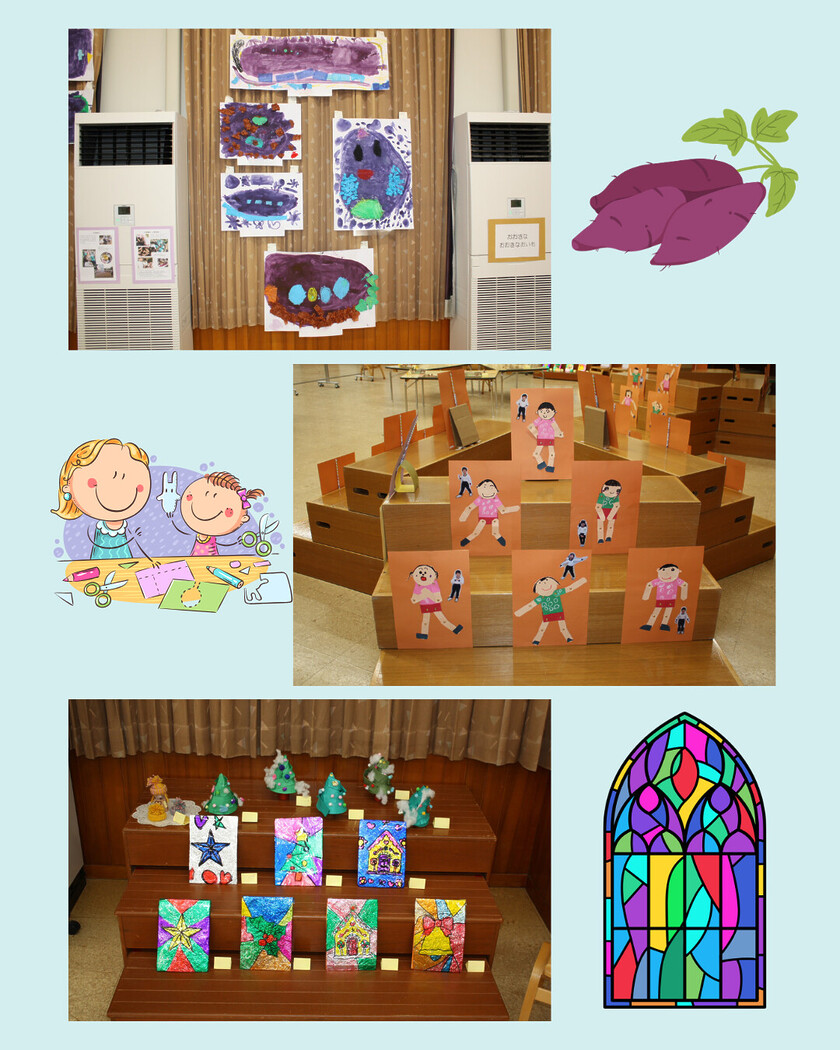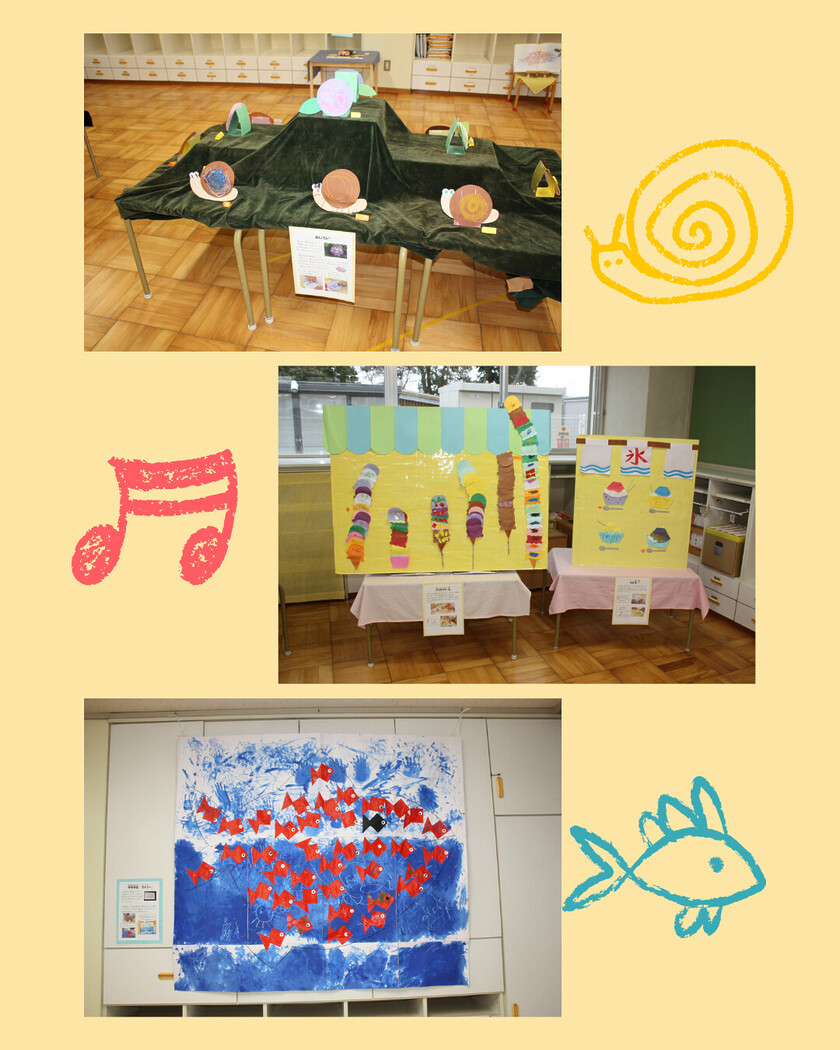 各学年、子どもたちの「楽しい!」「おもしろい!」「やってみたい!」という思いから広がっていった作品や、友だちと相談して協力して作り上げた作品など学年ごとに様々な表現方法が見られています!