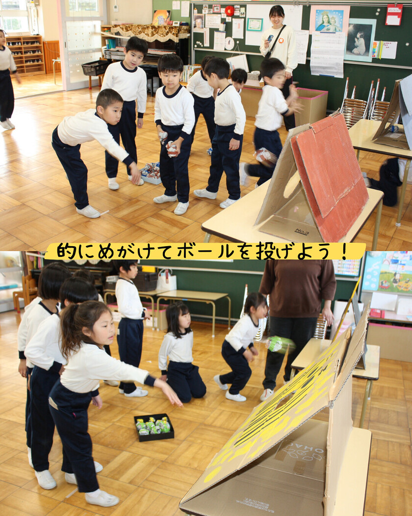 難易度別の手作り的にを倒したり、穴の中にボールを入れたりしました。仲間と協力する姿もたくさん見られました!