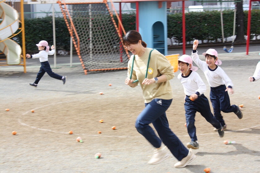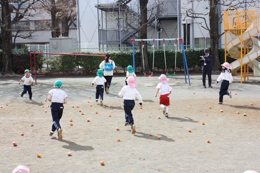 手作りミカンが散らばった園庭。それをどれだけ集められるかといったゲーム!