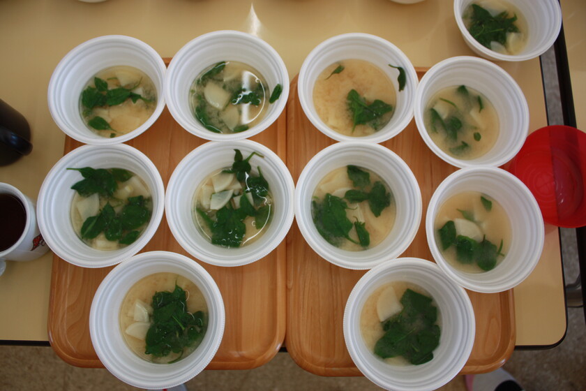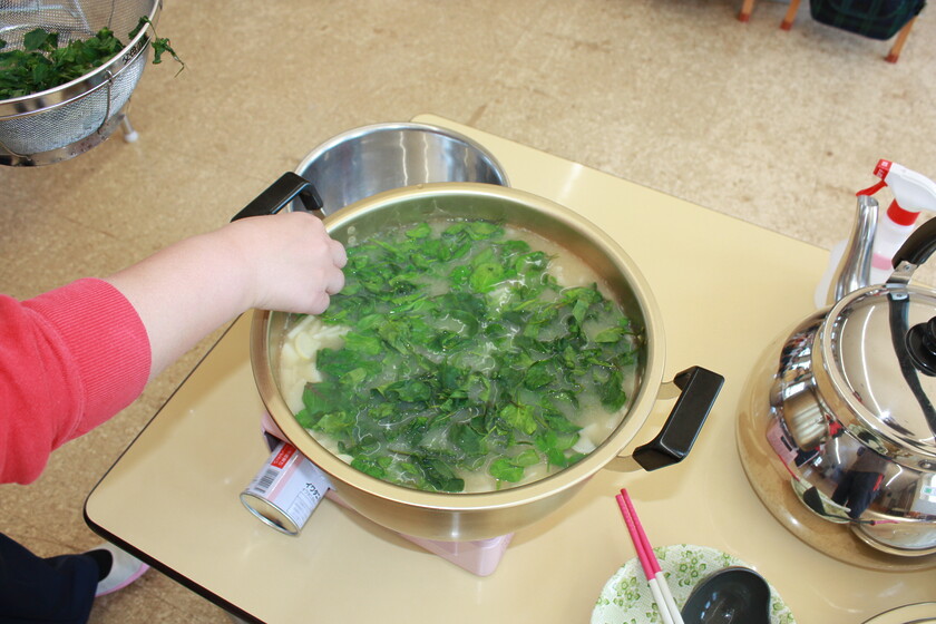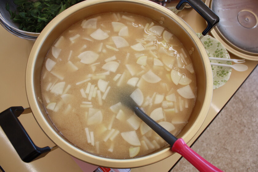 煮立って味噌を入れた後、最後に収穫したほうれん草も入れて完成です!